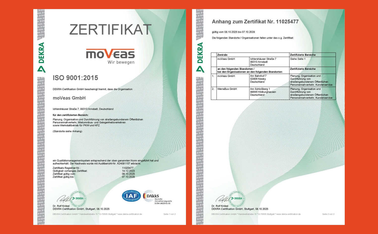 Die DEKRA Certification GmbH bescheinigt hiermit, dass unser Unternehmen moVeas GmbH für den zertifizierten Bereich Planung, Organisation und Durchführung von straßengebundenem Öffentlichen Personennahverkehr, Mietomnibus- und Gelegenheitsverkehren sowie Werkstattbetrieb für Pkw und Nfz ein Qualitätsmanagementsystem entsprechend der oben genannten Norm eingeführt hat und aufrechterhält.